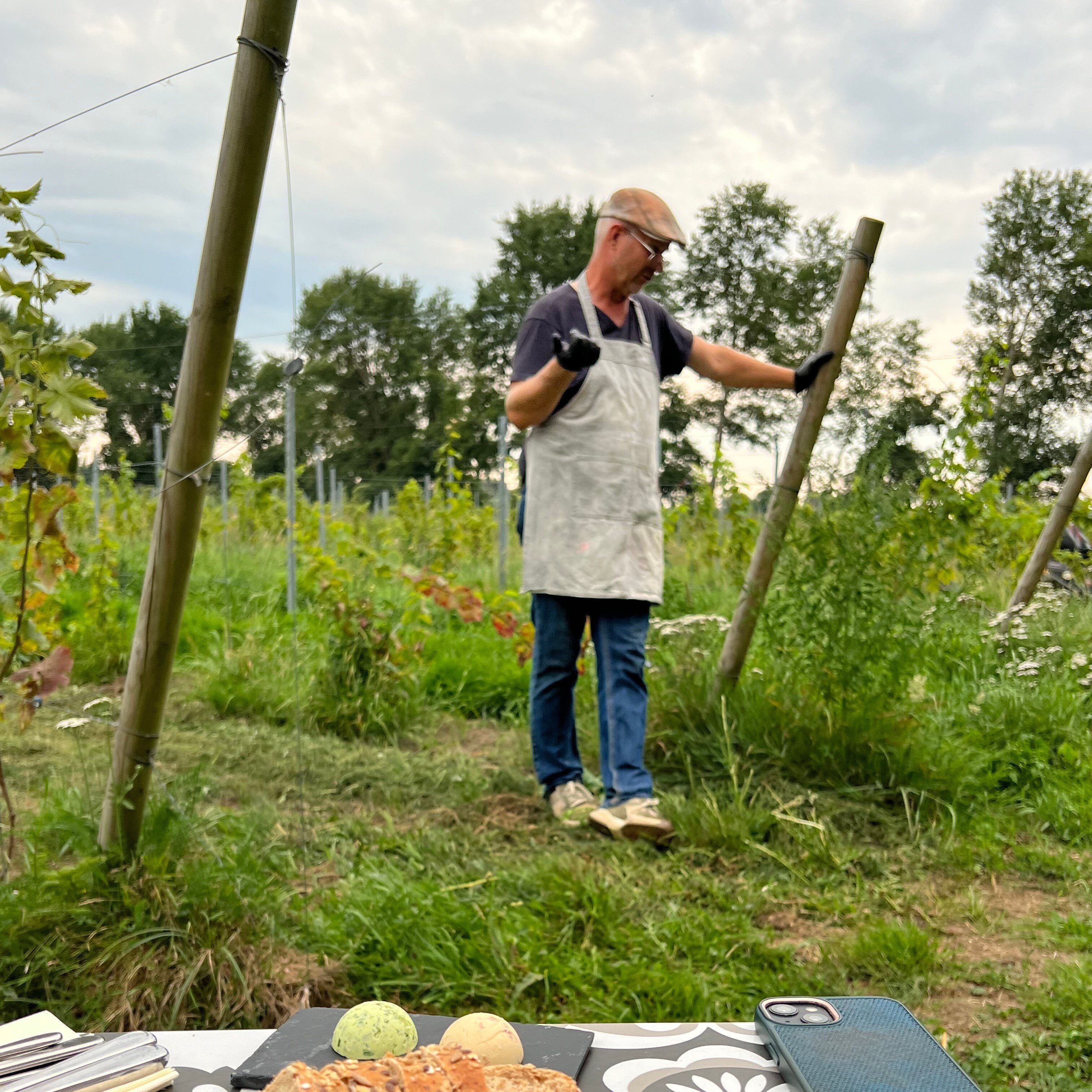 Je schuift aan bij een kleinschalig diner met een paar tafeltjes in het gras. Onze wijngaardenier kookt zelf een verzorgd driegangenmenu in zijn buitenkeuken, met bijpassende Nederlandse wijnen.